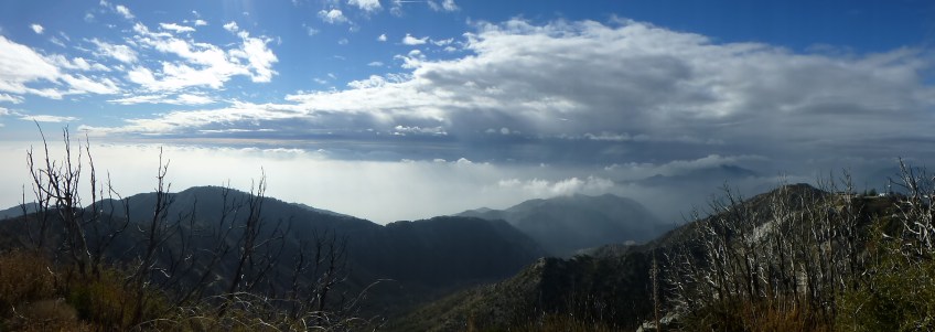 SGP_C_091 Published December 4, 2012 at 2432 × 864 in Between Two Layers Of Clouds View west from San Gabriel Peak at 1:33 pm with clouds starting to make it over Brown Mountain and Mt. Lukens from below as the clouds become more ominous from above. S