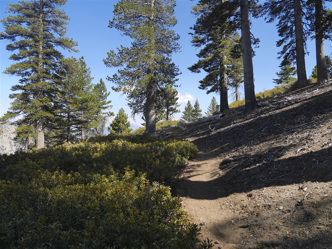 Throop Peak (elevation 9,138′) is located a short (but steep) way up from the junction of the Pacific Crest Trail and the Dawson Saddle Trail (one of my favorites). Its location makes it an easy destination to add to longer hikes reaching several other peaks along the Pacific Crest Trail nearby. Its north face typically holds onto snow after Angeles Crest Highway re-opens between Vincent Gap and Islip Saddle in the spring. At comparatively high elevation, Throop Peak’s north face also supports an excellent grove of Lodgepole Pines–a great spot to enjoy them is to sit on a log just below the peak and rest in their shade.