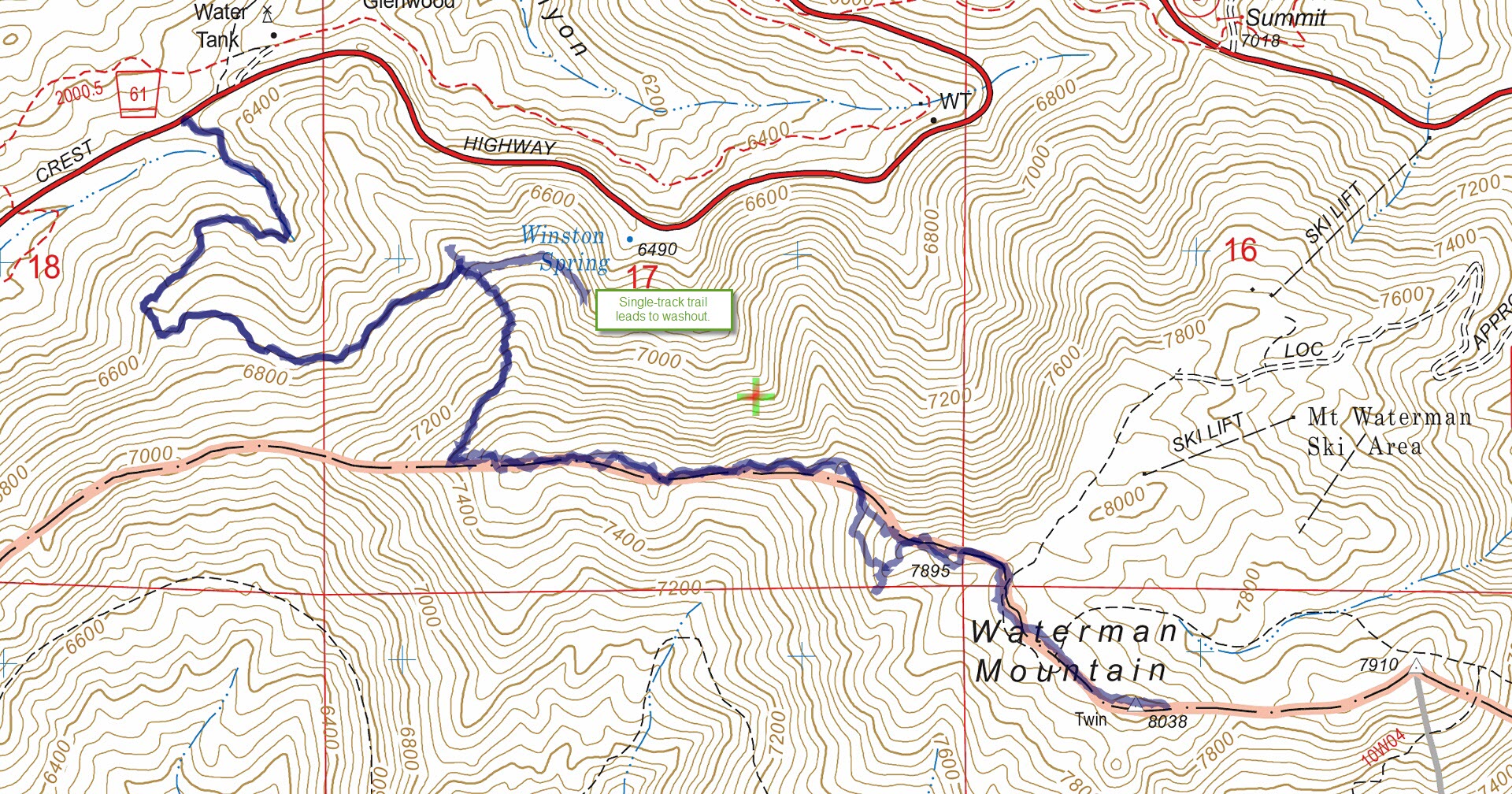 Track map for West Mt. Waterman Trail and West Mt. Waterman Ridge to Mt. Waterman from May 2017 using Backcountry Navigator (US Forest Service-2013 map) from my phone.