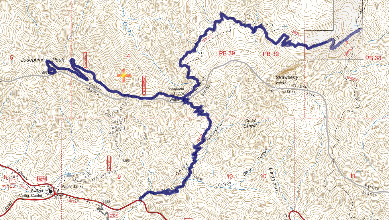 Josephine-1801-T Published February 17, 2018 at 1358 × 768 in Colby Canyon to Josephine Peak and Strawberry Meadow Track Map for Colby Canyon to Josephine Peak and Strawberry Meadow/Portrero from February 2018 using Backcountry Navigator (US Forest Service-2013 map) from my phone.