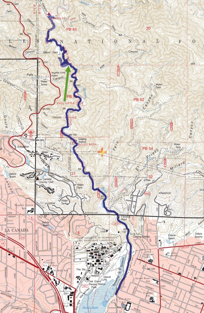 Track Map for the Gabrieleno Trail to Oakwilde Campground Ruins from January 2018 using Backcountry Navigator (US Forest Service-2013 map) from my phone.