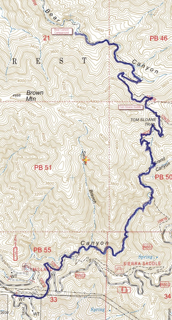 Track Map for Millard Canyon to Bear Canyon Campground from February 2018 using Backcountry Navigator (US Forest Service-2013 map) from my phone.