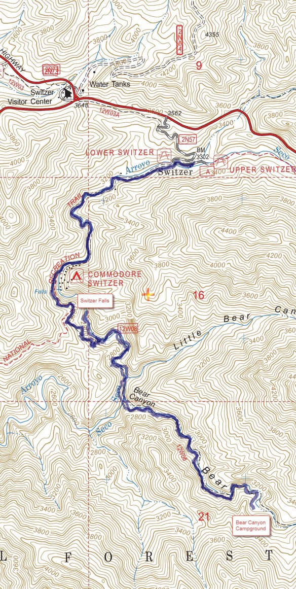 Track Map for Switzer Picnic Area to Bear Canyon Campground and Switzer Falls from January 2018 using Backcountry Navigator (US Forest Service-2013 map) from my phone.