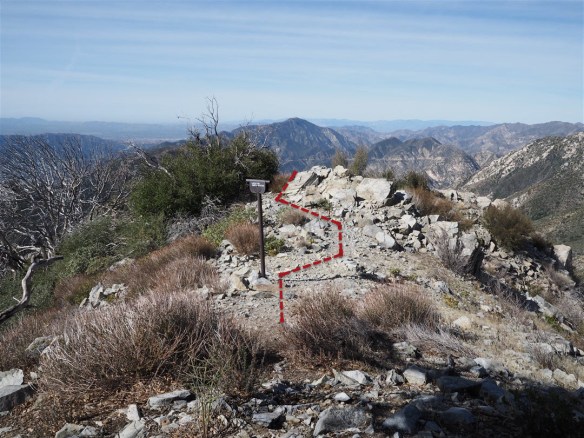 The west ridge of Mt. Lowe connects the Upper Sam Merrill Trail and Mt. Lowe Road making the most direct route to get from Mt. Lowe to the upper trailhead for the Tom Sloane Saddle Trail. To get to it follow the Upper Sam Merrill Trail down until you reach a junction with a view pipe marked “Locating Santa Monica.”