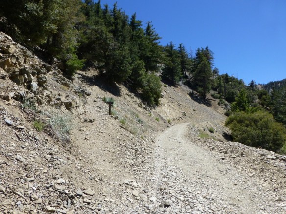 Junction to Baldy Bowl Trail (left) from road to Baldy Notch. Note: the trail sign reads: “Mt Baldy Trail”. The Baldy Bowl Trail is also know as the Ski Hut Trail.